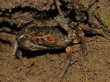- Esta obra contiene una traducción derivada de «Freshwater crab» de Wikipedia en inglés, publicada por sus editores bajo la Licencia de documentación libre de GNU y la Licencia Creative Commons Atribución-CompartirIgual 4.0 Internacional.