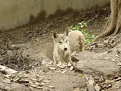 ![]() Lobo del Himalaya en cautividad en Bengladés, mudando. | ||