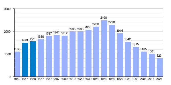 | Gráfica de evolución demográfica de Cantalpino[14] entre 1842 y 2021 |