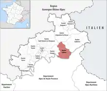 Una nueva redistribución territorial fue definida por decreto del 20 de febrero de 2014, para el departamento de Altos Alpes,[4] que entró en vigor en el momento de la primera renovación general de asamblearios departamentales después de dicho decreto, cuestión que pasó en marzo de 2015.