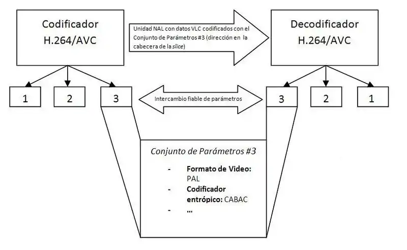 El mecanismo de conjuntos de parámetros de secuencia y de imagen disasocia la transmisión de información que cambia infrecuentemente de la transmisión de los valores de las muestras de las imágenes de video. Cada unidad NAL VCL contiene un identificador que se refiere al contenido del conjunto de parámetros de imagen relevante, y cada conjunto de parámetros de imagen contiene un identificador que se refiere al contenido del conjunto de parámetros de secuencia relevante. De esta manera, un pequeño conjunto de datos (el identificador) puede ser usado para referirse a un conjunto mucho más grande de información (el conjunto de parámetros) sin repetir la información de cada unidad NAL VCL. Los conjuntos de parámetros de secuencia e imagen pueden ser enviados bien por delante de la unidad NAL VCL a la que se refiere, como puede ser repetida para proporcionar más robustez ante la pérdida de datos. En algunas aplicaciones, los conjuntos de parámetros pueden ser enviados en el canal que transporta las unidades NAL VCL (transmisión en banda). En otras aplicaciones, puede ser beneficioso transmitir los conjuntos de parámetros fuera de banda usando un mecanismo de transporte más apropiado que el propio canal de video.