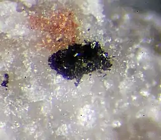 ![]() Capgaronnita ( microcristales negros) sobre cuarzo. Mina Frischer Muth, Eiserfeld, Siegen, Siegerland, Rhineland-Palatinado (Alemania) | ||