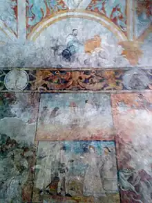 En el muro que constituye la entrada al recinto, contiene casi completa una pintura que representa El Gólgota o Calvario, y que fue ejecutada en tonalidades grises.[8] En el muro testero se distribuyen cuatro temas de la siguiente manera: un juicio final en la parte superior, distribuido en tres partes alrededor del recuadro central, se representan el “Juicio Final” con la variante de la inclusión de las fauces de Leviatán, a mano derecha, que devoran las almas de los condenados, mientras, a la izquierda se concentran las de los justos.[4] El registro inferior, tiene un espacio sin decorar en el centro, y sus dos recuadros representan “Creación de Eva”, “Tentación” y la “Expulsión del Paraíso”, así como dos franjas inferiores con friso ornamental.[4]