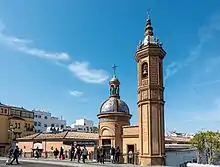 La construcción consta de dos cuerpos unidos por otro rectangular. Uno es un edificio bajo con una cúpula recubierta de cerámica. En la cúpula se encuentra el escudo de la Orden del Carmen. Sobre la cúpula hay un pequeño templete con columnas verdes y dentro del mismo unas esculturas de Santa Justa y Rufina que escudan a la Giralda.[2] El segundo cuerpo de planta octogonal, es una torre más esbelta y alta a modo de campanario. Por sus pequeñas dimensiones, ha sido comparado con un templete o humilladero.[2]