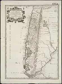 Reino de Chile según Juan de la Cruz Cano y Olmedilla, 1775. La zona del reino que ya estaba asentada en ese año sale denominada como "Chile Antiguo" y las por asentar donde se incluye la totalidad de la Patagonia se le denominó "Chile Moderno".