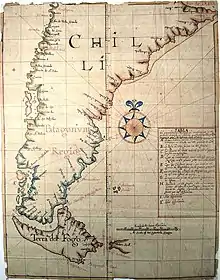 Aunque nominalmente en sus inicios se habló de la inclusión hasta de la desconocida Terra Australis,[15] la dominación española nunca logró imponerse totalmente sobre los mapuches, dada su bravura, a los cuales enfrentaron en la guerra de Arauco, ni en las tierras patagónicas; dado el obstáculo de la cordillera de los Andes; la región antártica, en tanto, no sería descubierta sino hasta avanzado el siglo XIX. A grandes rasgos, el reino de Chile abarcó principalmente el sector entre el despoblado de Atacama por el norte, el océano Pacífico por el oeste y el río Biobío por el sur (en el sector conocido como La Frontera), aunque existieron territorios aislados de origen español más al sur bajo su jurisdicción de manera intermitente, como los corregimientos de Valdivia, de Osorno y el gobierno de Chiloé.[lower-alpha 3] Hacia el este de la cordillera de los Andes, la gobernación de Chile llegó a abarcar también el territorio tucumano de 1553 hasta 1563 y el corregimiento de Cuyo desde 1568 y durante gran parte de su historia hasta la instauración del virreinato del Río de la Plata; provisoriamente creado por real cédula de 1776 y definitivamente instalado por otra de 1778. Momento en que dichos territorios, pasaron a la jurisdicción del nuevo virreinato rioplatense y durante la emancipación de España, a las Provincias Unidas del Río de la Plata, luego a la Confederación Argentina y finalmente a la jurisdicción de la actual república trasandina.