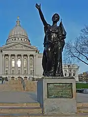 La estatua de Wisconsin en la cúpula fue esculpida durante 1920 por Daniel Chester French de Nueva York. Su mano izquierda sostiene un globo terráqueo coronado por un águila y su brazo derecho está extendido para simbolizar el lema del estado, "Adelante". Lleva un casco con el animal del estado, el tejón, encima. Está hecho de bronce hueco cubierto con pan de oro. Wisconsin mide 4,5 m de alto y pesa tres toneladas. La estatua comúnmente se identifica erróneamente como Lady Forward o Miss Forward, que es el nombre de otra estatua en los terrenos del capitolio.