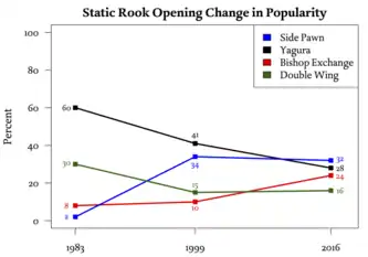 Si bien la apertura de Peón Lateral no era muy común hace unas décadas, se ha convertido en una de las aperturas de Doble Torre estática más populares entre jugadores profesionales, siendo la segunda apertura más comúnmente utilizada en 2016, así como la apertura de Doble Torre estática más popular del año (véase diagrama adyacente).