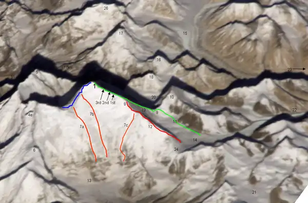 En 1992, una expedición chilena escaló exitosamente por esta ruta, convirtiéndose en la segunda expedición en lograrlo. Los escaladores que alcanzaron la cumbre fueron Rodrigo Jordan, Cristian García-Huidobro y Juan Sebastián Montes.[5]