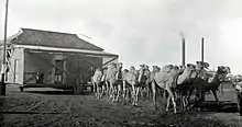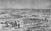 Una caravana de camellos o tren de camellos, es una serie de camellos que transportan pasajeros y mercancías en un servicio regular o semi-regular entre puntos. Aunque raramente viajaban más rápido que la velocidad humana, durante siglos la capacidad de los camellos de soportar condiciones duras les hizo ideales para la comunicación y el comercio en las zonas desérticas del norte de África y la península arábiga . Los trenes de camellos también se utilizaron con moderación en otros lugares del mundo. Desde principios del siglo XX han sido sustituidos en gran parte por vehículos motorizados o tráfico aéreo.[1]