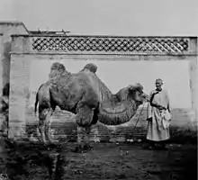 Las caravanas procedentes de ambos extremos de la ruta Hohhot-Gucheng estaban compuestas por camellos bactrianos de dos jorobas, adecuados para el clima de la zona, aunque muy ocasionalmente se podían ver dromedarios de una sola joroba llevados a esta ruta por los uigures ( "Turki", en El lenguaje de Lattimore) gente de la caravana de Hami[7] Normalmente, una caravana estaría compuesta por una serie de archivos ( Chinese, lian ), de hasta 18 camellos cada uno. Cada uno de los caravaneros de base, conocidos como los tiradores de camellos (Chinese, la luotuo-de ), estaba a cargo de uno de estos archivos. En la marcha, el trabajo del camellero consistía en conducir el primer camello de su limón con una cuerda atada a una clavija pegada al hocico, conduciendo cada uno de los otros camellos del limón por medio de una cuerda parecida por el camello de enfrente. de esto. Dos limones ( lian ) formaban un ba, y los tiradores de camellos de las dos limas se ayudaban mutuamente a la hora de cargar carga en los camellos al inicio de la marcha de cada día o de descargarla cuando se detenían . Para realizar su trabajo correctamente, los tiradores de camellos debían ser expertos en camellos: como comenta Lattimore, "como no se conoce ningún buen doctorado para él [un camello] cuando está enfermo, deben aprender a mantenerlo bien". Cuidar la salud de los camellos incluía la posibilidad de encontrar el mejor pastoreo disponible para ellos y mantenerlos alejados de las plantas venenosas; conocimiento de cuándo no debe permitirse que un camello beba demasiada agua; cómo aparcar los camellos durante la noche, que les permita obtener el mejor refugio posible de la nieve soplada por el viento en invierno; cómo distribuir correctamente la carga para evitar que haga daño al animal; y cómo tratar las heridas leves de los camellos, como ampollas o úlceras.[8]