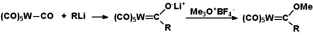 Reactivos de organolitio se adicionan a los carbonilos metálicos para producir aniones acilo de carbonilo metálico. La O-alquilación de estos aniones, por ejemplo, con sales de Meerwein (tetrafluoroboratos o trialquiloxonios), proporciona carbenos de Fischer:[1]