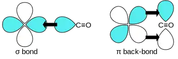 Los enlaces del monóxido de carbono (CO) a los metales de transición son sinérgicos. La unión tiene tres componentes, dando lugar a un triple enlace parcial. Se genera un enlace sigma por la superposición del par de electrones no enlazantes del orbital sp-híbrido del átomo de carbono del carbonilo con uno de los orbitales p vacíos del metal. Un par de enlaces π surgen de solapamiento entre orbitales d llenos del metal con un par de orbitales π-antienlazantes del carbono del CO. Este último tipo de unión requiere de que el metal tenga electrones en orbitales d, y que el metal se encuentre en un estado de oxidación relativamente bajo (<2) que hace que este proceso de retrodonación sea favorable. Como los electrones d del metal forman una interacción con el orbital π antienlazante del CO, se debilita el enlace carbono-oxígeno (en comparación con el monóxido de carbono libre), mientras que el enlace metal-carbono se fortalece. Debido al carácter de enlace múltiple de la unión M-CO, la distancia entre el metal y el carbono es relativamente corto, a menudo <1,8 Å, aproximadamente 0,2 Å más corto que un enlace alquil-metal.