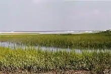 Los pantanos, ecosistemas intermareales dominados por vegetación herbácea, se pueden encontrar globalmente en las costas desde el ártico hasta los subtropicales. En los trópicos, los pantanos son reemplazados por manglares como la vegetación costera dominante.[17] Los pantanos tienen una alta productividad, con una gran parte de la producción primaria en biomasa subterránea. Esta biomasa subterránea puede formar depósitos de hasta 8 m de profundidad. Las marismas proporcionan un valioso hábitat para plantas, aves y peces juveniles, protegen el hábitat costero de las marejadas e inundaciones, y pueden reducir la carga de nutrientes en las aguas costeras.[18] De manera similar a los hábitats de manglares y pastos marinos, los pantanos también sirven como sumideros de carbono importantes. Los pantanos secuestran carbono en la biomasa subterránea debido a las altas tasas de sedimentación orgánica y la descomposición dominada anaeróbica.[19] los pantanos cubren aproximadamente 22,000 a 400,000 km 2 a nivel mundial, con una tasa de entierro de carbono estimada de 210 g C m −2 año −1 . Los pantanos han sido impactadas por los humanos durante siglos, incluida la modificación del pastoreo, la producción de heno, la recuperación de la agricultura, el desarrollo y los puertos, los estanques de evaporación para la producción de sal, la modificación de la acuicultura, el control de insectos, el poder de las mareas y la protección contra inundaciones.[20] Los pantanos también son susceptibles a la contaminación por petróleo, productos químicos industriales, como pesticidas, y, más comúnmente, a la eutrofización. Las especies introducidas, el aumento del nivel del mar, el embalse de los ríos y la disminución de la sedimentación son cambios adicionales a largo plazo que afectan el hábitat de los pantanos y, a su vez, pueden afectar el potencial de secuestro de carbono.[21]