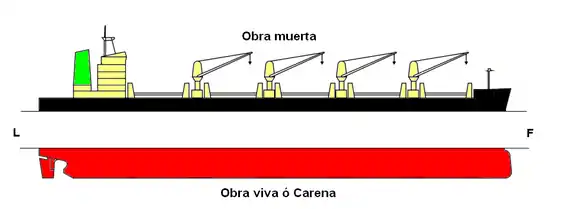 La obra viva es la parte del buque por debajo de la superficie de flotación, por tanto, correspondiente a la carena. La parte superior es la obra muerta, y se consideran espacios de la misma al casco, desde la flotación hasta la cubierta más alta que sea continua, resistente y estanca, y a las superestructuras que sean estancas. La obra muerta es, también, la reserva de flotabilidad que tiene el buque para hacer frente a un incremento del volumen sumergido. Con respecto a la obra viva y a la obra muerta, se puede hablar de la superficie y del volumen de cada una de ellas. Por ejemplo, la superficie de la obra viva será la superficie mojada del casco.