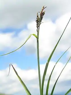 Esta juncia produce tallos de hasta 50 centímetros de altura, que crece en una mata o por solitaria. Las hojas son de color verde oscuro y rígidas, y las hojas de las temporadas anteriores pueden permanecer en la planta. La inflorescencia es acompañada por una corta bráctea y tiene de 1 a 3 espigas negras pistiladas y de 1 o 2 estaminadas.[1] La planta generalmente se reproduce vegetativamente , brotando retoños de su rizoma. También se propaga a través de estolones.[1] Tiene una red de raíz gruesa que le permite formar un césped y las raíces pueden crecer los 80 cm de profundidad en el suelo.[3] La planta, a veces, se reproduce sexualmente, produciendo semillas. Las semillas pueden permanecer viables durante 200 años.[1]