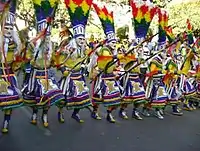 - Diablada: La Diablada es una danza de Oruro, Bolivia, llamada así por la careta y el traje de diablo que usan los bailarines. La danza es una representación de la Ñusta (Virgen del Socavón) que protegió y defendió de Wari al pueblo de Uru Uru (Oruro) que los castigaba con cuatro plagas en la sagrada serranía de los urus, también por la influencia católica representa el enfrentamiento entre las fuerzas del bien y del mal, así pues esta danza mezcla tanto elementos propios de las tradiciones católicas introducidas durante la conquista española y ritos ancestrales andinos.