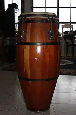 El tambor llamado Conga o tumbadora, de evidente origen bantú, es, según dice Fernando Ortiz: “…un tambor de origen africano, hecho de listones de madera y aros de hierro, de aproximadamente un metro de largo, forma de barril, y abierto en un extremo con un solo parche de cuero de buey fijado con clavos al cuerpo del tambor..” Antiguamente se afinaba por medio de calor, pero actualmente es afinado por medio de llaves metálicas.[20] El diámetro de las tumbadoras es el siguiente, de la más aguda a la más grave: requinto (9 a 10 pulgadas de diámetro), quinto (10 a 11 pulgadas), Conga (macho o tres-dos) (11 a 12 pulgadas), tumbadora (o hembra) (12 a 13 pulgadas), retumbadora (o mambisa) (14 pulgadas).[21]