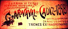 El Carnaval de Cádiz es uno de los carnavales más famosos e importantes de España, por lo que ha sido reconocido en 1980 conjuntamente con el Carnaval de Santa Cruz de Tenerife, con la declaración de Fiesta de Interés Turístico Internacional.[1][2] Ambos son los primeros carnavales de España con tal distinción.[3] Precisamente desde el año 2014, el Carnaval de Cádiz y el Carnaval de Santa Cruz de Tenerife están hermanados,[4] coincidiendo con el 30 aniversario del hermanamiento de ambas ciudades que tuvo lugar en 1984.[5] Ha sido también declarado Tesoro del Patrimonio Cultural Inmaterial de España.[6] En 2019 fue registrado en el Catálogo General de Patrimonio Histórico Andaluz (CGPHA) como Bien de Interés Cultural (BIC), por una orden publicada en el Decreto 609/2019 en boletín número 240 de 16/12/2019 del BOJA.[7] Todos los años durante los meses de enero y febrero se celebra en el Gran Teatro Falla el Concurso de Agrupaciones del Carnaval. En los últimos años parte de la población gaditana parece percibir con desagrado que la fuerte presencia turística durante la celebración está produciendo una deriva hacia formas festivas impropias en cuanto ajenas a las tradiciones del carnaval y dominadas por el ocio y el elevado consumo de alcohol.