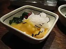 - El sashimi de Abura-sunoko son capas de carne a rayas hechas de la raíz de las aletas.