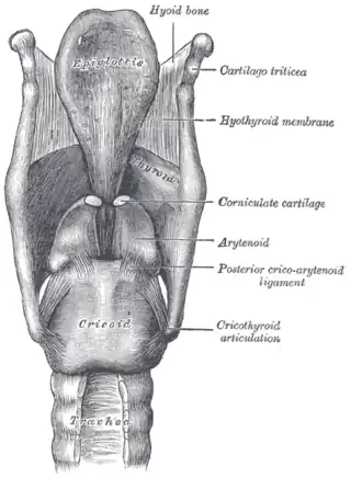 ![]() Ligamentos de la laringe. Vista posterior. (El cartílago corniculado está señalado en el centro a la derecha). | ||