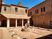 Adosado al muro derecho del templo se sitúa el claustro central. Éste, de planta cuadrada, estuvo en origen porticado, con seis pilares cada lado. En la actualidad, las galerías perimetrales se encuentran totalmente derruidas, conservándose únicamente los arranques de las bóvedas. Asimismo, son perceptibles vestigios de azulejos de Cuenca del siglo XVI y restos de pinturas murales gótico-mudéjares. Alrededor de este claustro se encuentran una serie de dependencias, como son la sala capitular, la antigua sacristía, sala «de Profundis» y el refectorio.