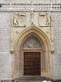 La portada de la iglesia se alzó en 1486 y fue ubicada originalmente en el lateral izquierdo del templo, proporcionando el acceso de los fieles directamente desde el exterior del monasterio. Está formada por arquivoltas apuntadas decoradas con vegetales, animales y algunos motivos figurativos humanos. La arquería está situada bajo un gran arco conopial con macollas. En el tímpano se representa el motivo de la Compasión de la Virgen, que conforme a los cánones iconográficos bajomedievales, presenta a la Virgen sentada sujetando con sus brazos a su Hijo muerto, y los símbolos de la luna y el sol sobre los brazos de la cruz.