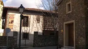 El frente principal está dividido en dos tramos; uno compacto, en el que se abren dos huecos adintelados; y otro diáfano, abierto, en el piso inferior y con galería acristalada en el superior.