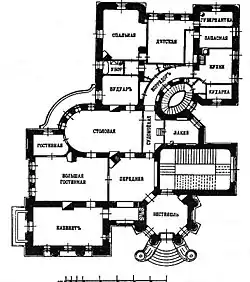 El apartamento más grande, que perteneció a Gorodetsky, consistía en un estudio, un gran salón, un comedor, una habitación para los niños, un tocador, un dormitorio, una habitación para una niñera, una habitación para invitados, tres habitaciones para sirvientes, una cocina, un lavadero, dos baños y dos almacenes. En el piso de arriba, había un apartamento de similar diseño y tamaño al de Gorodetsky.[nota 6] De todas formas, tenía una habitación menos que éste, pero, en cambio, poseía una terraza desde donde se podía disfrutar de una vista panorámica de toda Kiev.[7][nota 7]