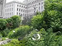 Debido a lo empinado del terreno sobre que fue construida, tuvo que ser especialmente diseñada con un material resistente como es el hormigón para encajar en sus cimientos correctamente. Si se mira de frente, el edificio parece tener únicamente tres plantas, pero, visto desde atrás, se ven sus seis pisos claramente.[19] Una parte de los cimientos del edificio se hizo con pilares de hormigón, y la otra con cimientos continuos. Generalmente, estos dos sistemas no combinan bien, pero Gorodetsky tuvo éxito al esconder ese problema técnico, de tal manera que casi no se nota.[19]