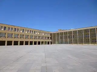 Proyectado por el arquitecto Rafael Moneo en 1973-1974,[1] la obra finalizó en 1980.[2] La planta del edificio está concebida con una geometría triangular,[3] con dos volúmenes triangulares desiguales.[4] Los exteriores están acabados con piedra arenisca.[2]