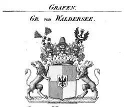 El escudo de armas de los condes de Waldersee se remonta al de la antigua y extinta familia noble de los valdesios. El escudo de armas de los condes de Waldeser, que constaba de seis campos en rojo y amarillo, seis banderas, así como tres mechones y frondas, tenía una forma modificada con cuatro campos del príncipe Joaquín Ernesto en el escudo de armas de los príncipes de Anhalt y más tarde se integró en el gran escudo de armas del Ducado de Anhalt. De esta forma también forma la base del escudo de armas de los condes de Waldersee. Los colores también se pueden encontrar como parte de los escudos de armas de Dessau y Dessau-Roßlau como símbolo del distrito de Waldersee.