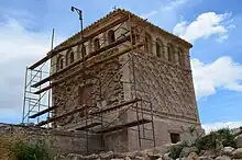 Su planta es cuadrada, de 5,40 m de lado, y consta de tres pisos en altura, diferenciados también exteriormente por el tratamiento de los paramentos murales. El primer piso está realizado en parte en piedra sillar y en él se abre el vano adintelado de ingreso, el segundo está decorado con un amplio paño de ladrillo resaltado formando motivos romboidales enmarcados por bandas de esquinillas y el tercero está recorrido por una galería de arcos de medio punto doblados de tradición aragonesa, cegados en el siglo XIX.