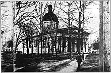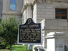 Cuando el gobierno estatal se trasladó a Indianápolis en diciembre de 1824, el gobierno estaba alojado en el Palacio de Justicia del Condado de Marion. El palacio de justicia se había construido con fondos estatales en 1822 después de que se eligiera Indianápolis como el sitio para el nuevo capitolio. El palacio de justicia sirvió como edificio del capitolio del estado durante doce años. En ese momento, Indianápolis era un sitio fronterizo, casi 100 km del asentamiento más cercano de importancia, lo que hace que la construcción a gran escala no sea práctica.[3]