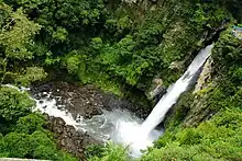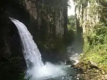 La cascada principal tiene una altura aproximada de 18–24 metros. Hay un puente sobre el barranco que conecta ambas partes del bosque. Al otro lado, hay dos cascadas más pequeñas que se pueden ver a partir de algunos de los senderos en la zona.[1]
