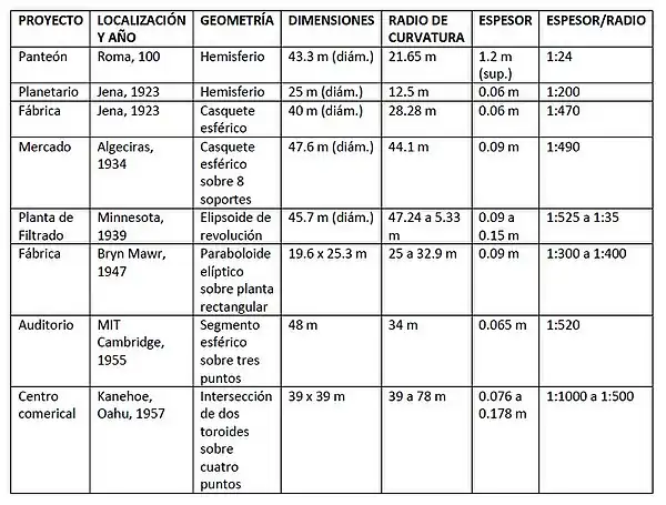 Es importante señalar que tan sólo las formas anticlásticas, como el paraboloide hiperbólico, pertenecen realmente a la era moderna. Su éxito inicial se debió a la necesidad de cubrir grandes áreas con métodos eficientes y baratos, sin tener que construir grandes estructuras de andamiaje. La eficiencia de estas estructuras se puede comprobar con la relación espesor radio de las cúpulas construidas en la historia: