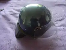 La forma más simple es una carcasa dura con relleno reforzado, una correa de barbilla y una visera con bisagra (normalmente de policarbonato). Estas viseras para cascos de protección antidisturbios suelen ser curvadas hacia los lados y rectas hacia arriba y hacia abajo, no hacia ambos lados como en el caso de los cascos de motocicleta más antiguos. Uno de los accesorios es un protector de nuca.