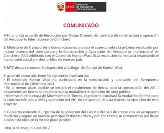 El ministro de Transportes y Comunicaciones Bruno Giuffra aseguró que el consorcio Kuntur Wasi no demandará al Estado peruano tras la resolución del contrato de la construcción del aeropuerto de Chinchero, en Cusco. “Llegamos al acuerdo de que lo más conveniente para las dos partes es alejarnos de una demanda internacional”[24]