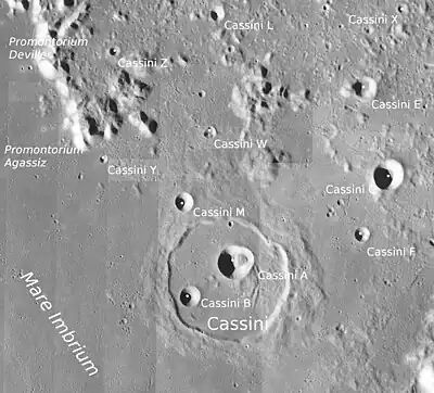 ![]() Cráter Cassini (Detalle de la cartografía tomada por la misión espacial Lunar Orbiter 4 en 1967) | ||