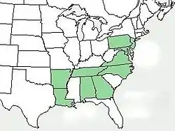 En bosques mixtos de suelos arenosos.[3] Nativa y endémica de Estados Unidos (Maryland, Carolina del Norte, Tennessee y Virginia)[4]