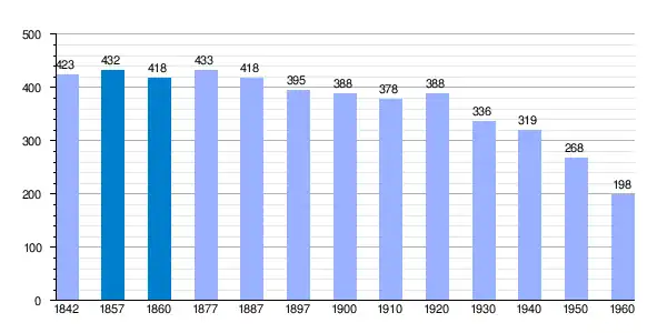 | Gráfica de evolución demográfica de Castejón de Sobrarbe[3] entre 1842 y 1960 |
