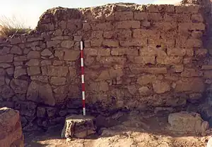 Las excavaciones sistemáticas del yacimiento arqueológico han descubierto un poblado de calle central, de planta pseudo-rectangular, con unos 1000 m² de superficie (unos 70 por 15 m), completamente amurallado. Un camino enlosado recorre la ladera occidental del cerro hasta una puerta principal de dos batientes donde se aprecian testimonios de circulación de carros (carriladas, guardacantones).