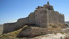 Las partes de esta ciudadela eran grandes muros de piedra de 3 metros de ancho y 7 metros de alto, cuyas murallas poseían al menos dos aspilleras. Dos torres de vigilancia en lados opuestos a los de la colina, un patio de armas donde los soldados solían entrenar y afilar sus armas para antes de sus combates.[1]