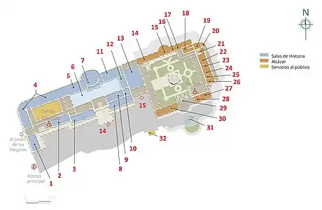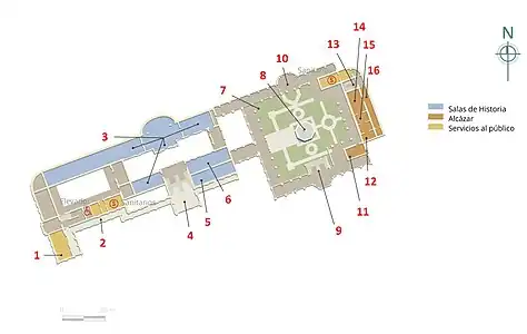 A partir de su elección como sede del Museo Nacional de Historia, se encuentra dividido en tres áreas: el recinto central y el alcázar, en la primera planta; y el área de exposiciones temporales en la parte superior.[4] En total, contiene 34 salas de exposiciones tanto permanentes como temporales en las cuales se recrean acontecimientos históricos del país.[61]