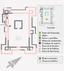 Las cuatro torres esquineras se encontraban unidas por una muralla de tapial y mampuestos, técnica constructiva similar al del resto de los elementos, de la que actualmente se conserva una longitud de unos escasos 27 metros. Adosadas a la muralla en los lados de mayor longitud dos pequeñas torres macizas hoy prácticamente desaparecidas servirían de refuerzo para la construcción y posiblemente definieran la estructura acodad que permitía la entrada a la fortificación. Al exterior de la muralla y las torres y siguiendo su perfil se localiza una barbacana que actuaba como antemuro y muro de contención. Esta construcción única poseía dos funciones diferentes según se trate del sector oeste, donde actuaría como segunda muralla y en el este donde actuaba de basamento para el enrasamiento del resto de estructuras y talud que impediría el deslizamiento del terreno hacia los acantilados. La entrada a la fortificación debía realizarse por la muralla sur donde la barbacana realizaba un acodo.
