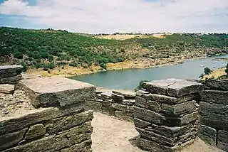 Se construyó en la cima de un acantilado en posición dominante sobre el río Guadiana, de hecho es una pequeña fortificación romana, de planta rectangular, con piedras de esquisto, material abundante en la región. Este sitio arqueológico, testimonio de la invasión romana de la península ibérica, fue fechado entre el siglo II a. C. y el siglo I a. C.