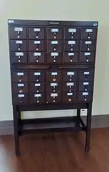 Los Catálogos de biblioteca originariamente como listas de manuscrito, se ubicaban por el formato (folio, cuarto, etc.) o en un arreglo alfabético por el autor.[3]Los catálogos impresos, a veces llamados los catálogos de diccionario permitieron al estudiante ir a una biblioteca para ganar una idea de su contenido. Estos serían interpolados a veces con las hojas en blanco en las cuales las adiciones podrían ser registradas. Los primeros catálogos de fichas aparecieron en el del siglo XIX, permitiendo mucho más flexibilidad, y hacia el final del siglo XX el OPAC fue desarrollado (véase abajo).