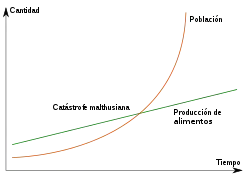 En el año 1798, Thomas Malthus publicó su Ensayo sobre el principio de la población.[1] En este, pronosticó que la población aumentaría con más rapidez que el suministro de comida. Explicó que la población aumenta en progresión geométrica, mientras que el suministro de comida solo puede aumentar en progresión aritmética (esto fue una modelización para simplificar el difícil proceso de estimación de la base de recursos, y la escogió como hipótesis optimista que sirviera de límite en la situación tecnológica de la época). Predijo que cuando no hubiera suficiente comida para la población, se produciría una catástrofe, la limitación del crecimiento demográfico por debajo de su máximo potencial, esto es, de doblar la población cada 10-15 años, como África en la actualidad[cita requerida], por medio de la miseria, aunque, y como él explica, escoge el límite libre de crecimiento en doblar la población cada 25 años, una estimación conservadora, para mantener la validez de la aproximación. Malthus teorizó que esta catástrofe solo se podría evitar con contracepción, y métodos parecidos (como él decía, el aumento de la población, se ve limitado por medidas morales, vicio, y miseria (el vicio lo consideraba una rama de la miseria, pero lo mantenía para marcar la diferencia, no hay que olvidar que era un clérigo)).[cita requerida]