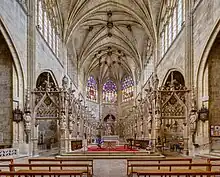 En el interior, la nave ancha es iluminada por las ventanas clerestory con vidrio grisaille. Por la noche, las luces en la tracería flamígera de las ventanas del clerestorio tienen una vista destacada. El vitral del coro es del siglo XIX. Esta catedral era famosa por su suntuosa liturgia del siglo XVI, y por su órgano de 1605 en el extremo oeste. El púlpito original con su baldaquín de piedra tallada delicadamente todavía está en su lugar. El claustro del siglo XVI es ahora un pasaje público adyacente a un aparcamiento, cuyo exterior es atractivo al ser iluminado por la noche.