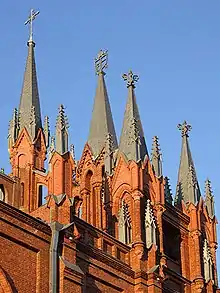 La catedral, construida en un estilo neogótico, es una pseudobasílica con tres naves. Fue edificada completamente con ladrillo rojo y no fue enfoscada externamente. La nave principal de cinco intercolumnios se extiende por 65 metros, con brazos laterales de 13 metros de largo. La torre de linterna octogonal sobre el crucero es de 30 metros de alto. La fachada se basó en el diseño de la abadía de Westminster y la torre, libremente, del de la catedral de Milán.[4][5] De forma típica a las iglesias de estilo antiguo, cada nave lateral está reforzada por cinco contrafuertes: los diez juntos simbolizan los Diez Mandamientos. Las cruces fueron erigidas, como parte de la renovación, sobrepasando cada torre principal; el pináculo de la fachada central y los dos otros pináculos de la fachada muestran la cimera de Juan Pablo II y del arzobispo Tadeusz Kondrusiewicz.[5]